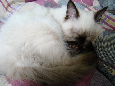 Сейчас она у мене уже в возрасте, ей 8-9 лет. Но в полгода она была неотличима от твоего: та же чёрненькая мордочка, белая шерстка, голубые глаза. С возрастом на мордочке стали проявляться белые прогалины, белая шерсть на теле потеряла свою белизну и стала даже какой-то чуть сероватой. Только воротник остался белоснежным. Первые "седые" волосы полезли с хвоста. Стареет, ничего не поделаешь.