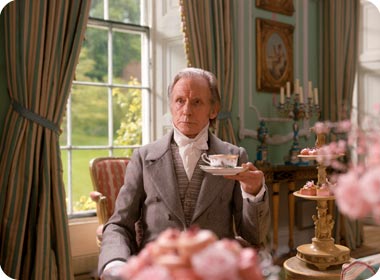 Заметить это сравнение помогает погружение в эпоху. Оно происходит при помощи замечательной работы художников-постановщиков под руководством Кейв Куинн («На игле», сериал «Великая») и художницы по костюмам Александры Бирн («Золотой век», «Доктор Стрэндж», «Убийство в Восточном экспрессе»). Высокие воротники мужских и женских одеяний, которые иллюзорно превращают головы завсегдатаев светских раутов в блюда, недвусмысленно отсылают к сатире Остин. А цвет вечерних платьев и смокингов утончённых леди и благородных джентльменов перманентно меняется в зависимости от эмоционального состояния героев.