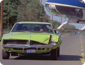 Когда фильм и есть одна большая, изнурительная погоня, объективно мыслить становится куда сложнее. И все же, на фоне искореженного металла многочисленных преследователей отдельного упоминания заслуживает схватка на двухполосном шоссе равных по мощи полицейского Dodge Polara 1972 года со слегка подмятым по сюжету «геройским» Charger’ом. Самоуверенность полицейского – предвестник падения, в конкретном случае столба электропередач на крышу казенного авто. Чуть позже становится ясно, что это был лишь мини-босс. Финальный соперник приходит из облаков – популярный вертолет Bell 206 в модификации Jet Ranger с шерифом на борту. Но и этого мало – вызывающее поведение верховного служителя фемиды закона вкупе с нехваткой топлива «летуна» ставит крест на принципе «всегда идти до конца».