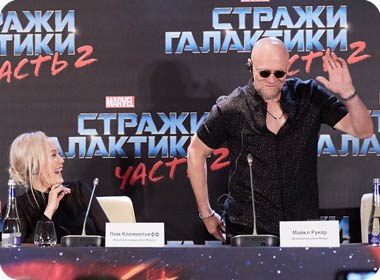 Представлять картину в российской столице приехал режиссёр обоих (и грядущей третьей) частей – Джеймс Ганн, исполнитель роли синекожего космического пирата Йонду – Майкл Рукер и примерившая на себя роль новой героини во франшизе Пол Клементьефф.